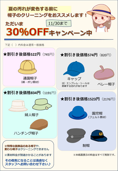 夏に活躍する帽子のクリーニングが今なら30%OFF! ぜひこの機会にご利用ください。